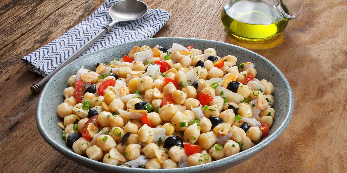 Misture o bacalhau, o grão de bico, a cebola, o tomate, a salsinha e as azeitonas e tempere com pimenta, limão e azeite a gosto.