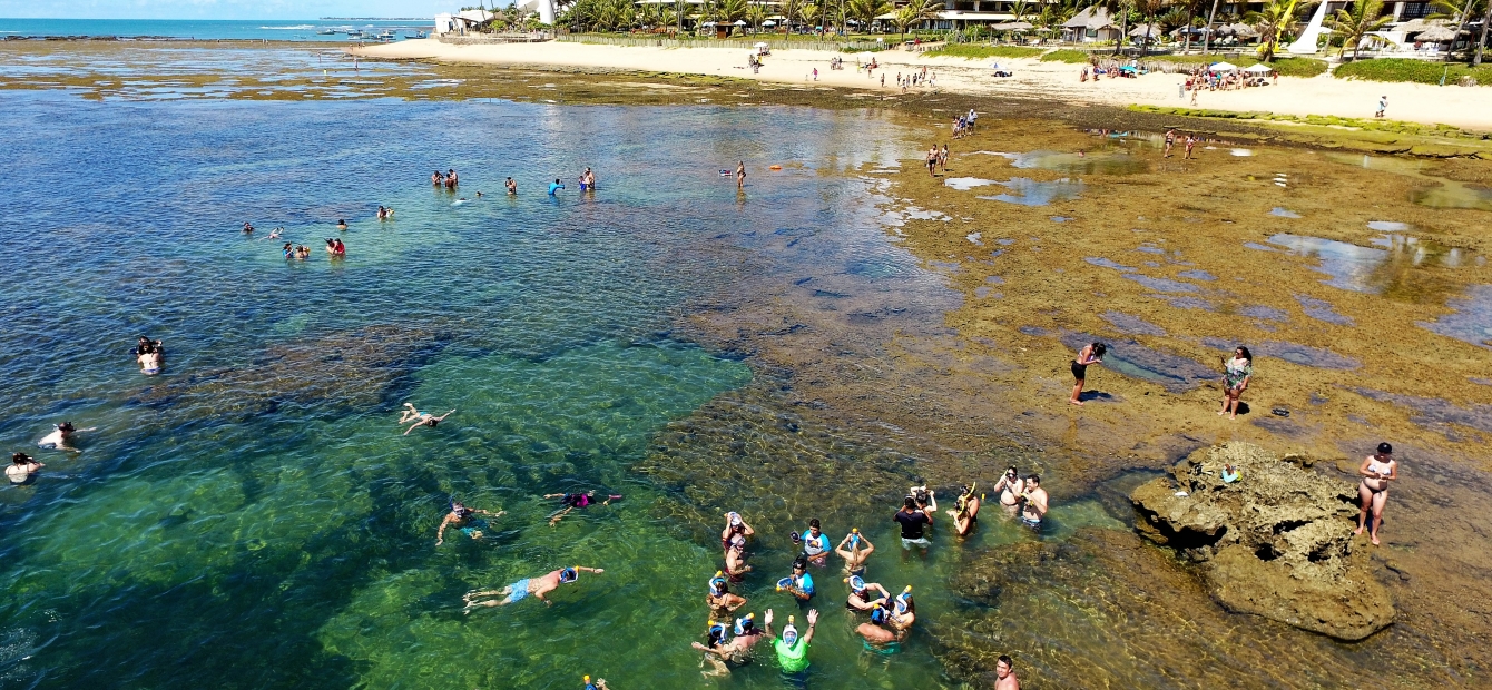 No canto esquerdo da praia, os recifes formam piscinas que ficam cheias de peixinhos e podem ser um ótimo entretenimento para os pequenos.