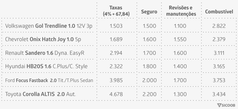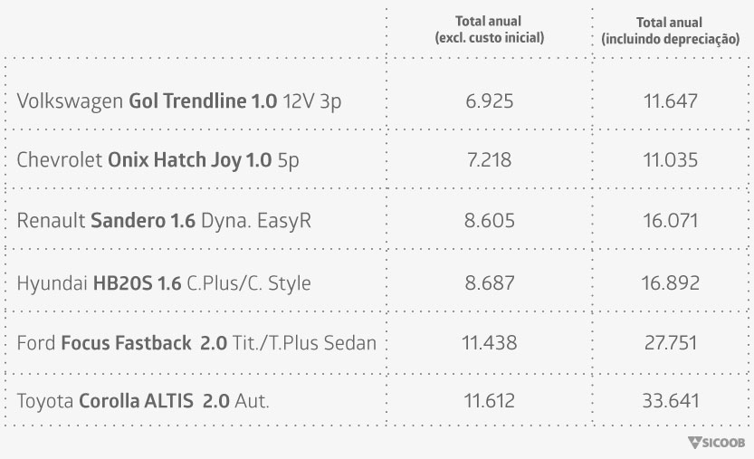 **Todos os valores apresentados são médias expressas em R$, considerando-se: para cálculo de taxas, IPVA = 4% do valor venal do veículo + R$ 63,69 referente ao seguro DPVAT com taxa de R$ 4,15 para pagamento em cota única; valores médios de seguros automotivos consultados no site seguroauto.org (ATENÇÃO: o preço real das apólices pode apresentar grandes variações de acordo com a cidade brasileira, o ano do veículo e com o perfil do cliente); para cálculo do valor gasto em combustível, foi considerada uma distância percorrida igual a 10.000 km no ano (média de 833 km por mês), preço médio da gasolina a R$ 3,64 e tabela de km/L do Inmetro.